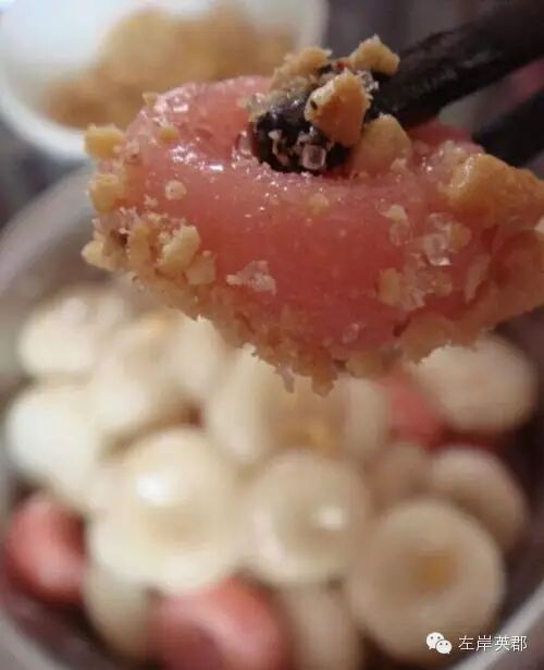 糯米粉加凉水,调成面团,然后搓成跳棋、玻璃珠大小的丸子,放在案桌上,用手掌轻轻一按,使之成为扁圆,最后用拇指往中间一押,即成中间下凹的糖粿了。糖粿做好之后,把水烧开,放糖粿、乌糖,煮片刻即成。煮好之后,在上边洒上一层花生仁敷,装在白瓷碗里,像玉一样玲珑。