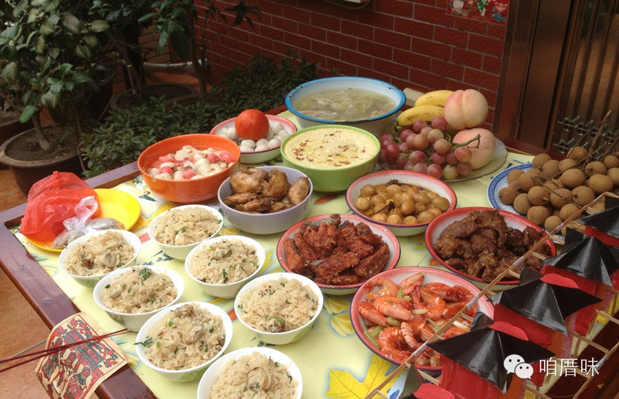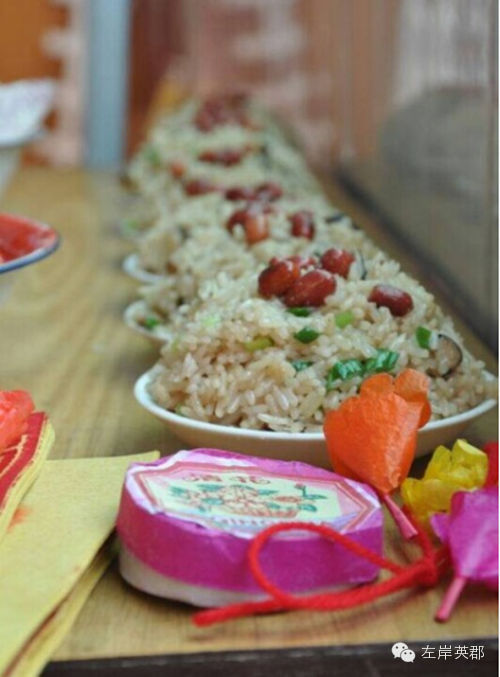 一般敬咸饭,并在咸饭上压几粒炒花生米。咸饭要装四碗,装得尖尖的,在床的东西南北四个方位都摆上一碗,床的中间还要摆一碗汤,汤里一定要有鸡蛋和金针菇两样东西。